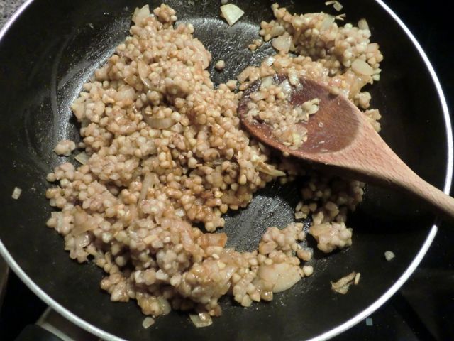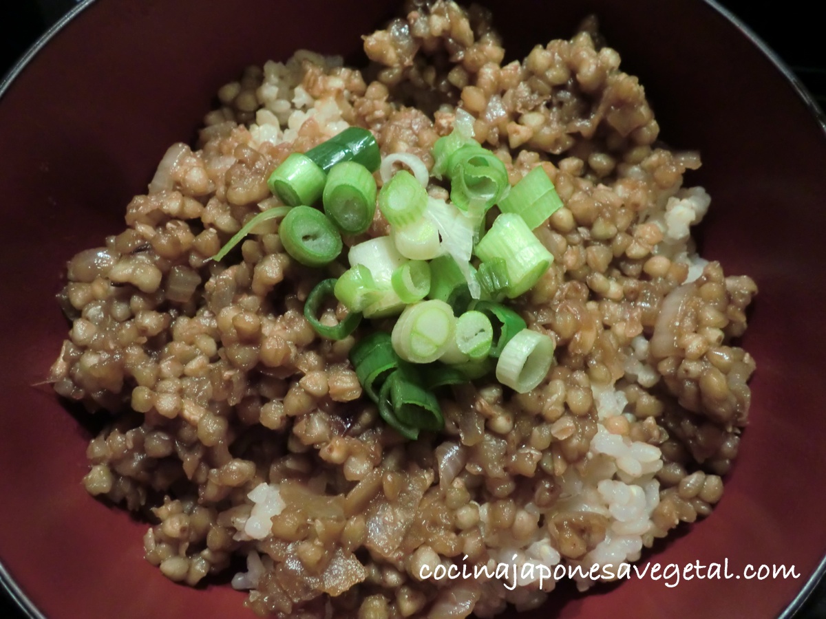 - Poner arroz caliente en un bol y cubrir su superficie con el trigo sarraceno que hemos cocinado.