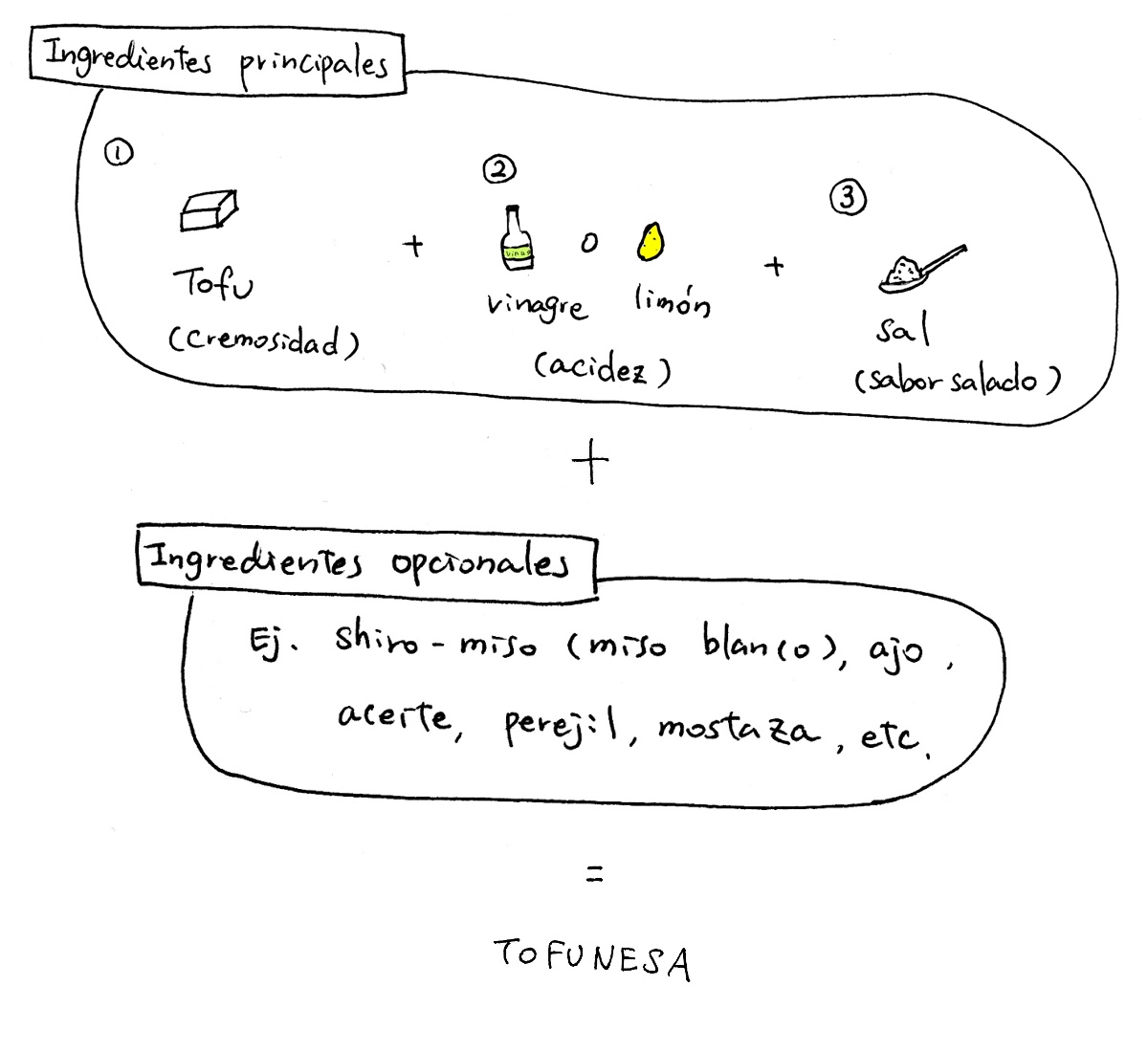 Por eso, aquí he hecho un pequeño resumen sobre la fórmula más básica para combinar los ingredientes de la tofunesa. El truco para poder combinar los ingredientes con libertad y elaborar una salsa a su gusto es dominar los ingredientes básicos que no pueden faltar y los opcionales que sirven para personalizar el sabor. Aquí va la explicación: