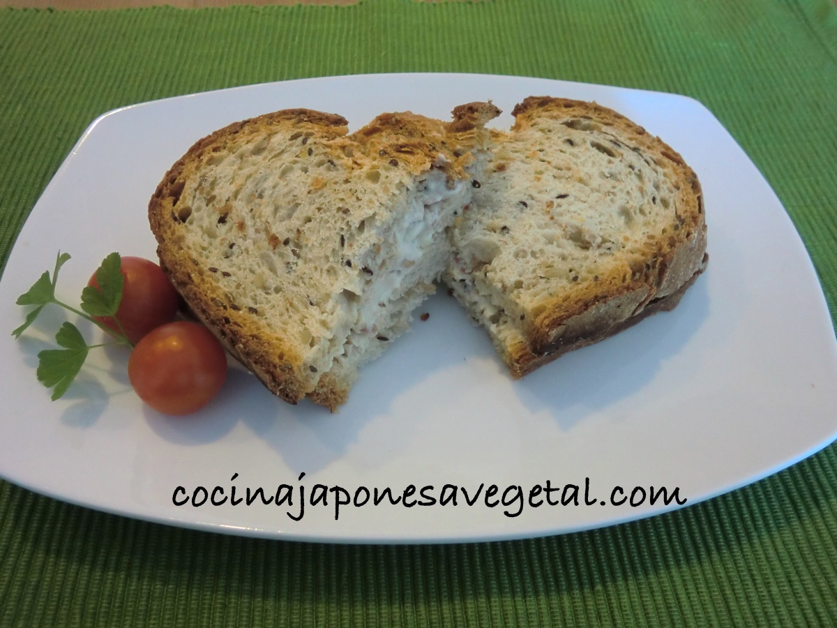 Con la tofunesa que hemos preparado, hemos hecho un sandwich con nueces. Como hemos explicado previamente, la combinación de ingredientes para hacer tofunesa se puede modificar a voluntad.