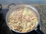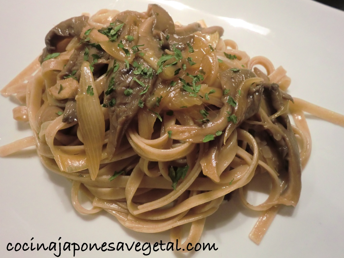 Queríamos hacer este plato con algunas verduras que fácilmente podamos conseguir en los supermercados de España y finalmente hemos elegido gírgolas y cebolletas. Estos dos ingredientes, además de combinarse bien con la salsa, se cocinan muy rápido, por lo que al mismo tiempo que cocemos la pasta, podemos terminar también la preparación de la salsa.
