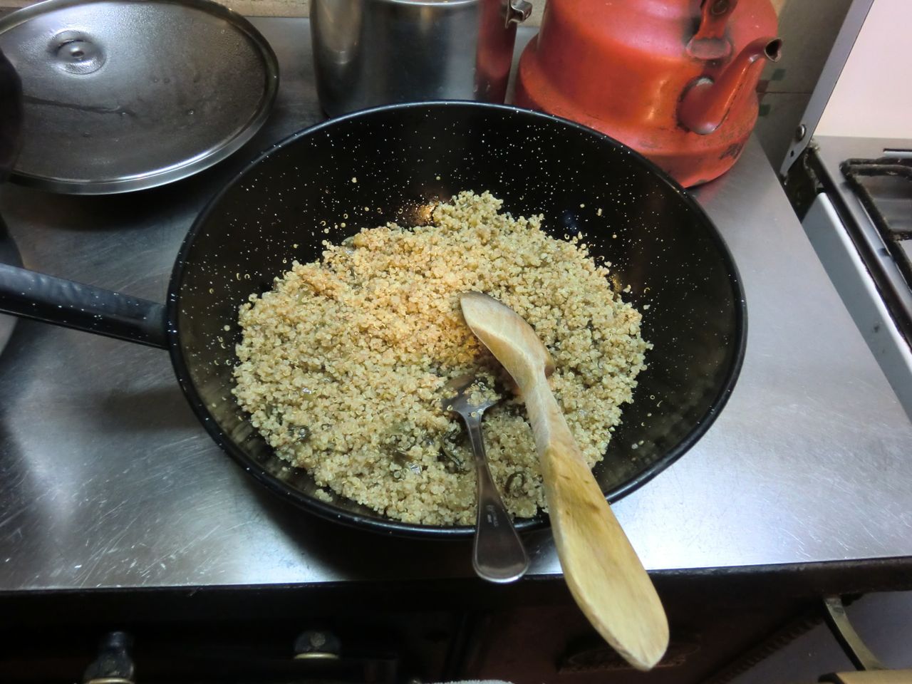 No habíamos probado nunca la quinoa. Sus granos tienen una forma particular, ya que están rodeados del germen que parece un hilo. Su textura es ligeramente resistente y causa una sensación divertida dentro de la boca.
