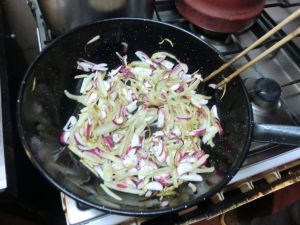 Cocinamos también el nitsuke de acelgas y rábanos para la cena. Nos sorprendió que los rábanos estuvieran buenos así salteados, porque siempre los asociábamos con ensaladas para comer crudos.