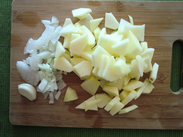 - Cortar la manzana en ocho trozos y luego cortarlos finamente (unos milímetros de grosor). Picar la cebolla y rallar el ajo.