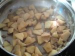 - Añadir la manzana, sal y vino tinto. Taparla sartén y dejar cocer a fuego lento durante 5 o 6 minutos.