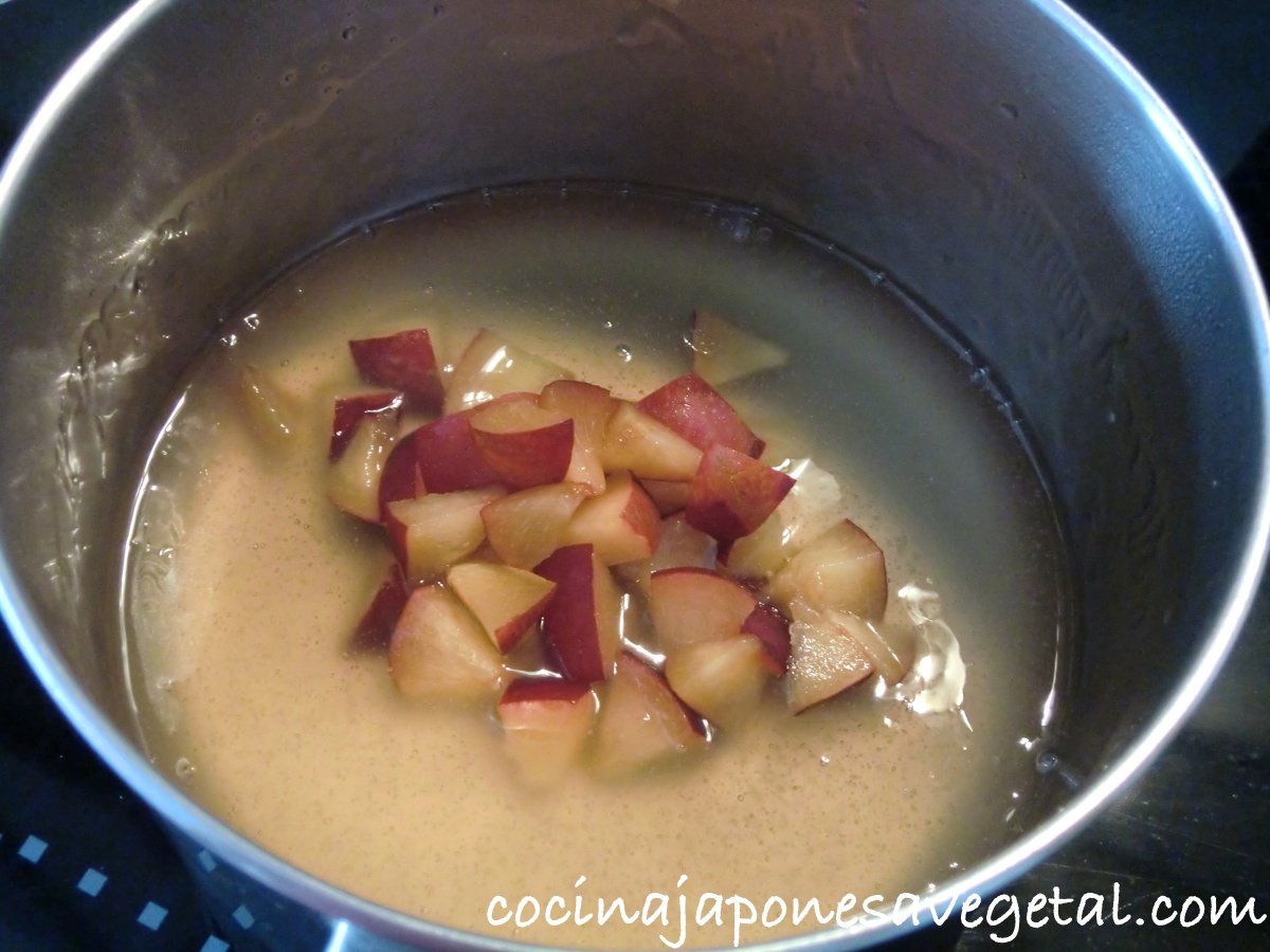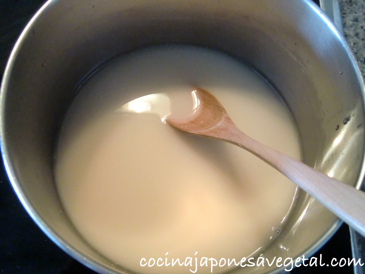 - Poner en una cazuela zumo de manzana, umesu y kuzu. Después de unos minutos, mezclar todo con una espátula o cuchara de madera. En este momento, veréis que el líquido tiene un color blanco.