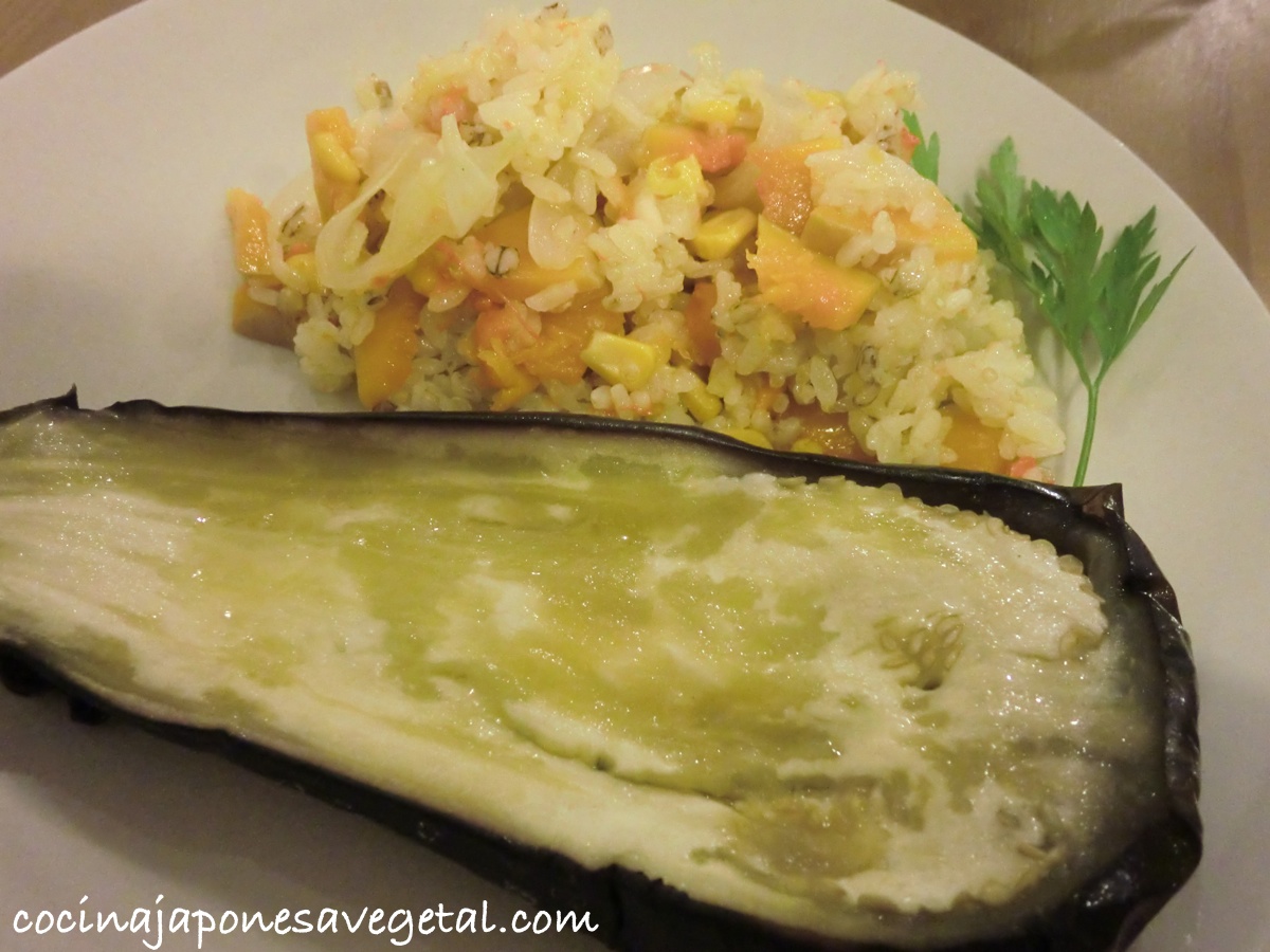 Es una receta que nos dio una vecina nuestra de mi tierra natal japonesa. Como la vecina cultiva berenjenas grandes, nos regaló algunas junto con esta receta.