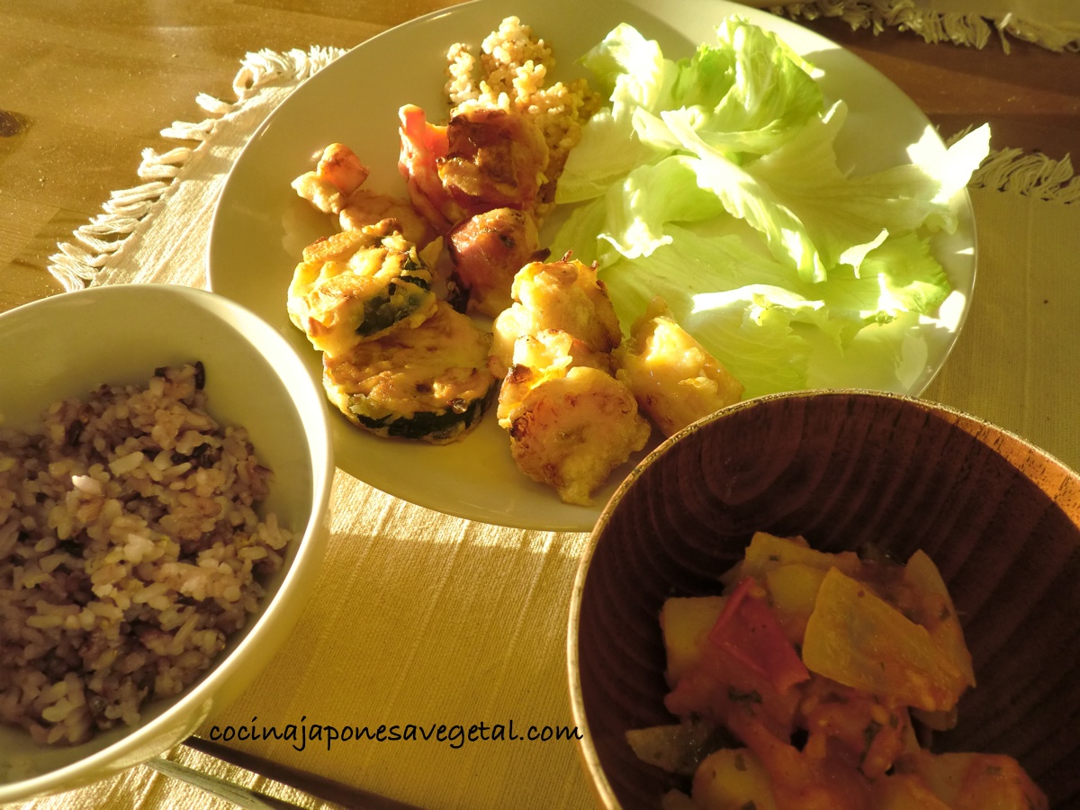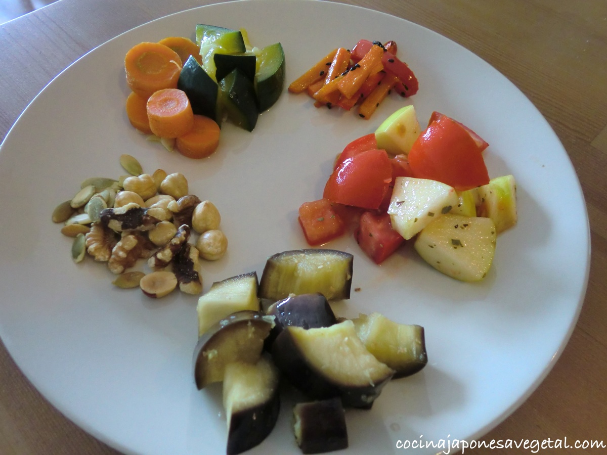 - Tempura de zanahoria, calabacín, pimiento rojo y plátano (con el rebozado hecho de leche de soja, harina y almendras laminadas)