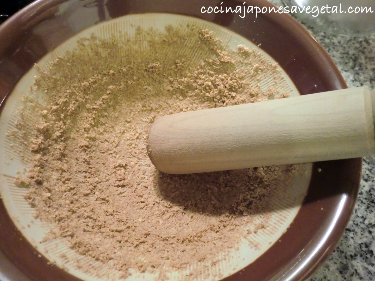 Para la preparación de este plato hemos utilizado un suribachi, el mortero japonés, que tiene una superficie rugosa con rayas finas en el interior para poder machacar ingredientes pequeños como sésamo.