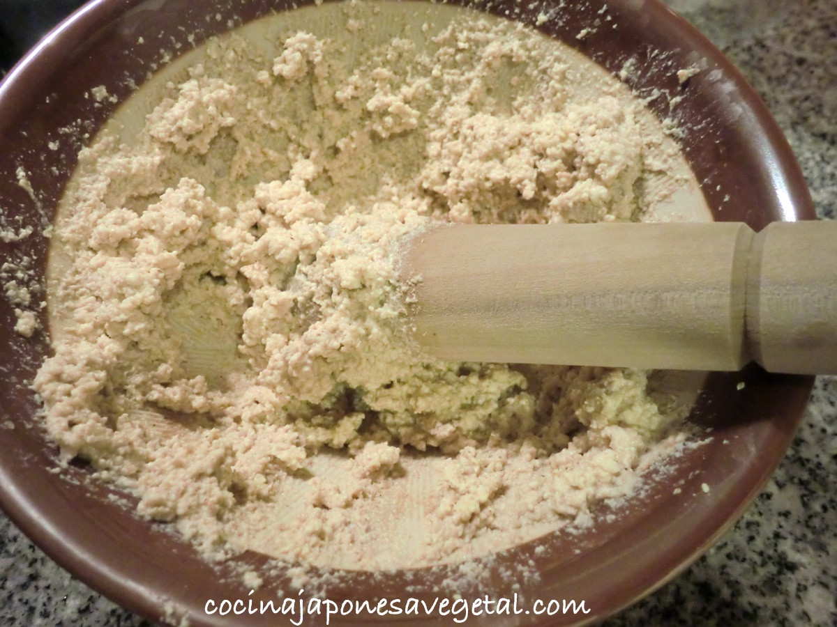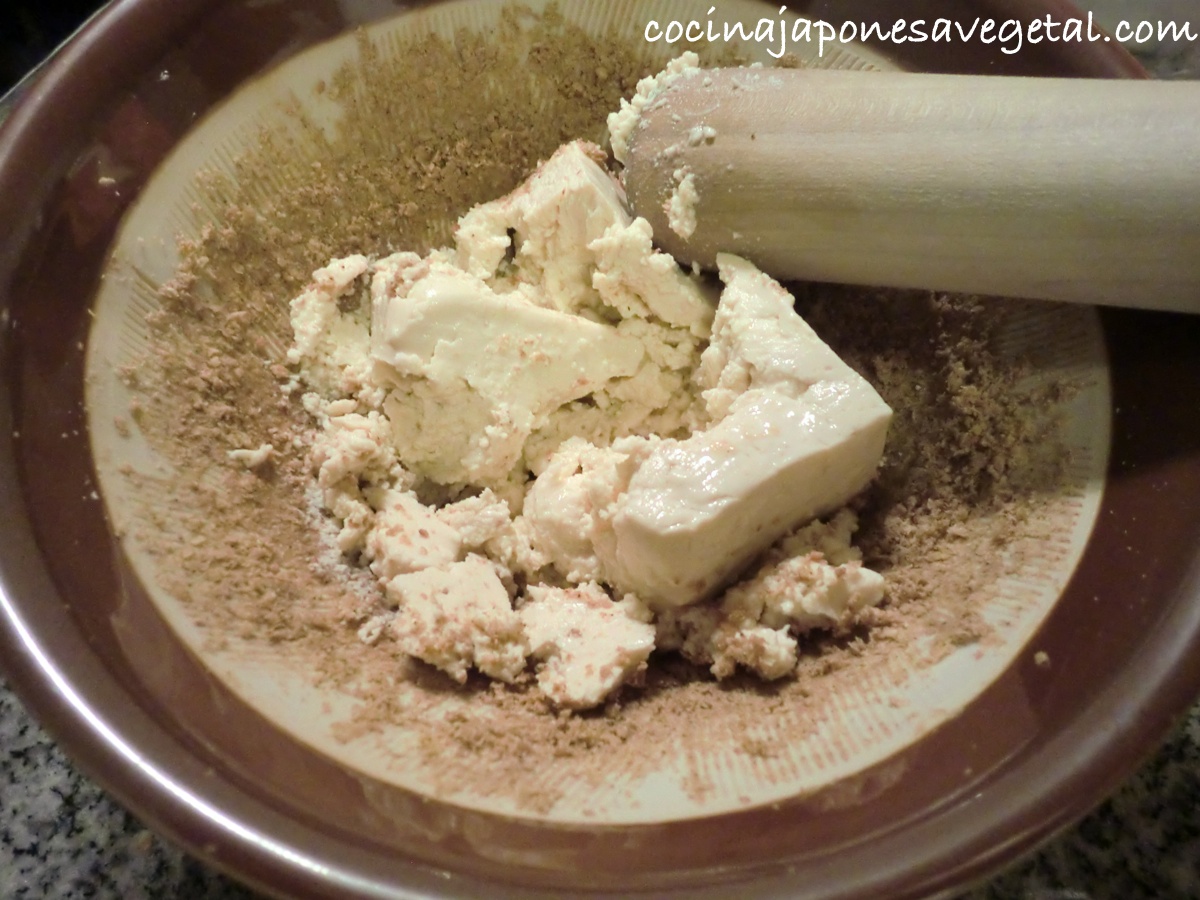Pero si no tenéis suribachi no pasa nada. Podemos utilizar un triturador eléctrico, o bien comprar sésamo ya triturado. O, si no encontráis sésamo triturado en tiendas, podemos utilizar tahín (pasta de sésamo utilizada en la cocina árabe). Con tahín, el sabor sería un poco más fuerte, pero la combinación de tofu, tahín y sal (o salsa de soja) es buena también para acompañar con pan o verduras.