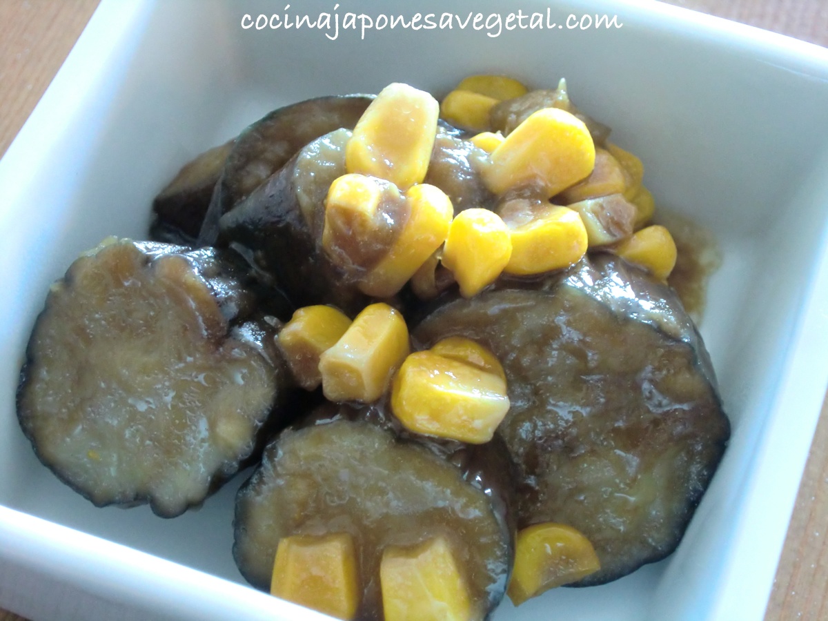 - Añadir maíz y agua y cocer a fuego lento tapado hasta que la berenjena esté muy tierna (unos 10 minutos). Si se ve que durante la cocción falta agua, ir añadiendo poco a poco para que no se queme.