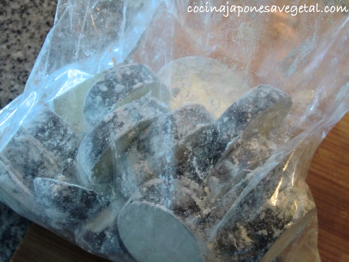 - Cortar la berenjena en rodajas de un centímetro y rebozarla con harina.