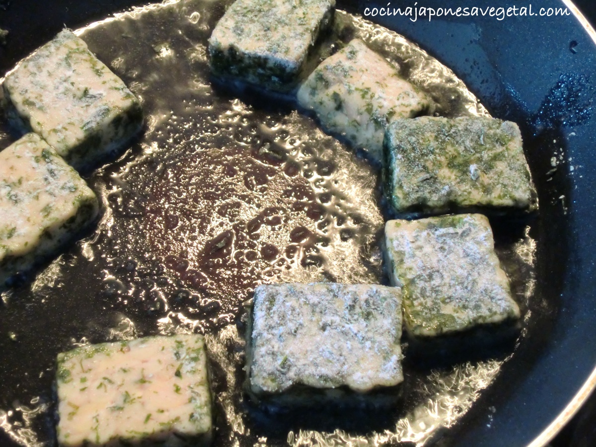 La receta es muy sencilla, como siempre en este blog, pero hay un truco importante: primero rebozar el tempe con aonori y después con fécula de patata porque si invertimos el orden, el aonori no se pega al tempe.