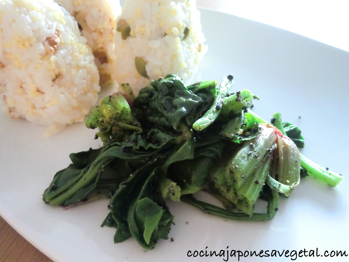 - Cortar las espinacas entre 3 y 5 cm. aproximadamente, mezclar con sésamo y poner salsa de soja probando el punto de sal al gusto.