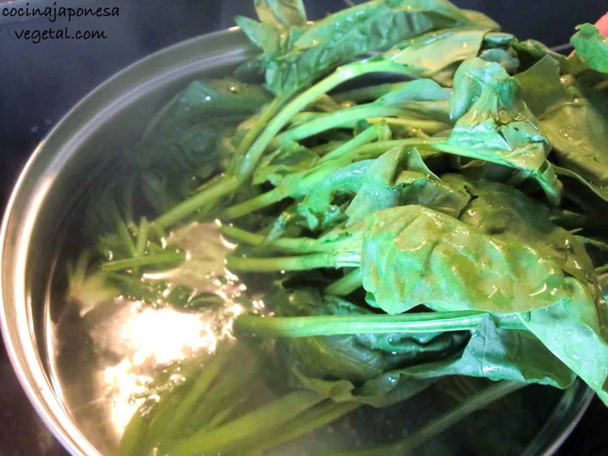Una de las maneras más sencillas y típicas de comer espinacas en Japón sería ohitashi o goma-ae. «Ohitashi» consiste en espinacas cocidas sazonadas con salsa de soja y normalmente se acompañan de copos secos de bonito «katsuo-bushi», mientras que «goma-ae», que ya presentamos en otra ocasión, se prepara con sésamo.