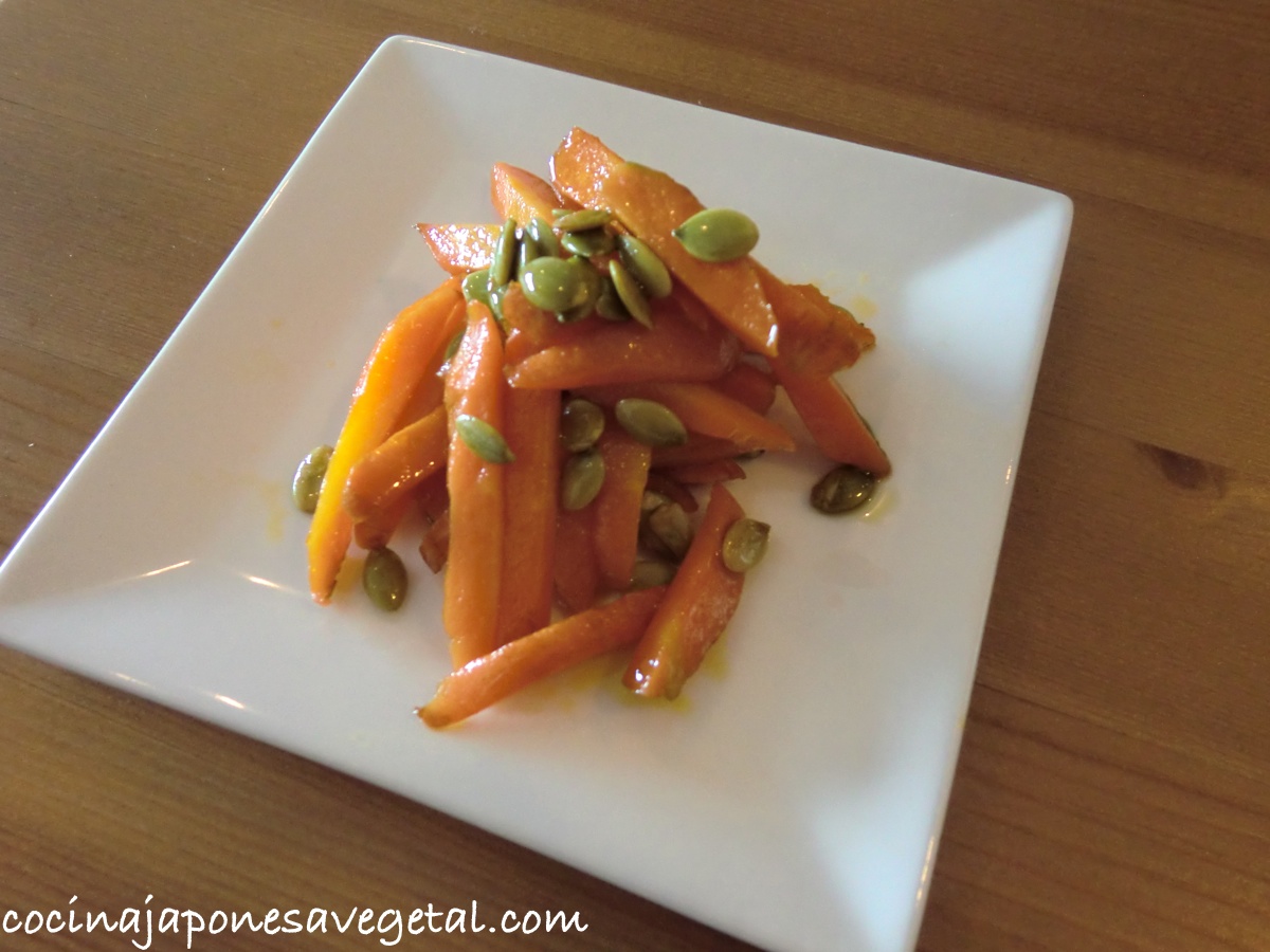 Nuestra kimpira de hoy se prepara con zanahoria, aceite de oliva y la sal. Es una versión sencilla, pero por eso mismo la dulzura de la zanahoria destaca mucho. Os recomendamos poner un poco de semillas de calabaza porque, además de dar un toque crujiente, la combinación de dos colores, naranja y verde, es bonita.
