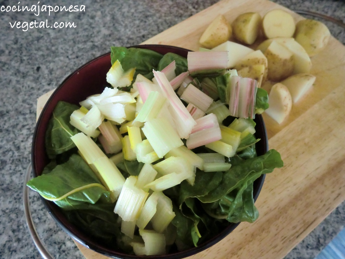 - Cortar las patatas en trozos. Cortar las acelgas; más finamente la parte del tronco, y en trozos más grandes, la parte de la hoja.