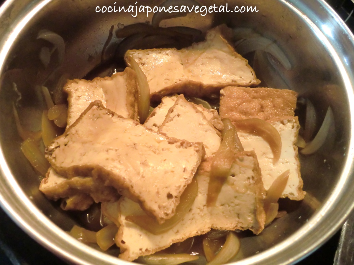 - Poner el atsuage cortado junto con la salsa de soja en la cazuela y mezclar suavemente todos los ingredientes procurando no estropear el atsuage.