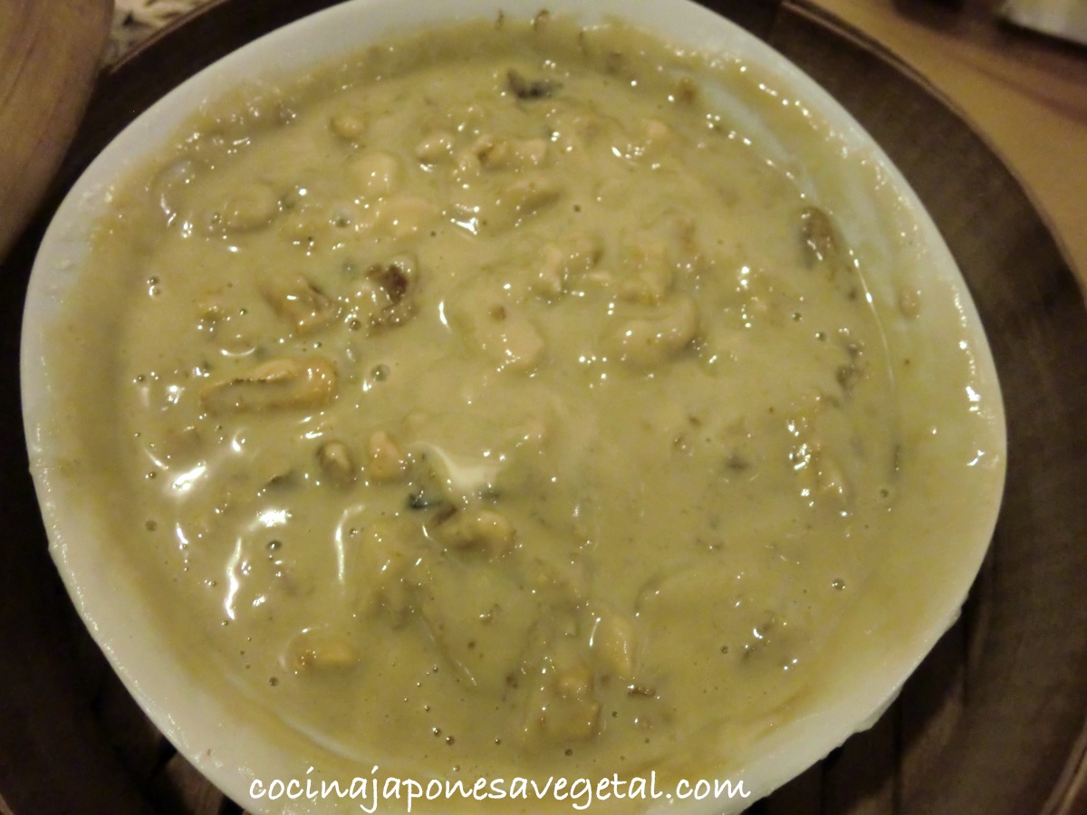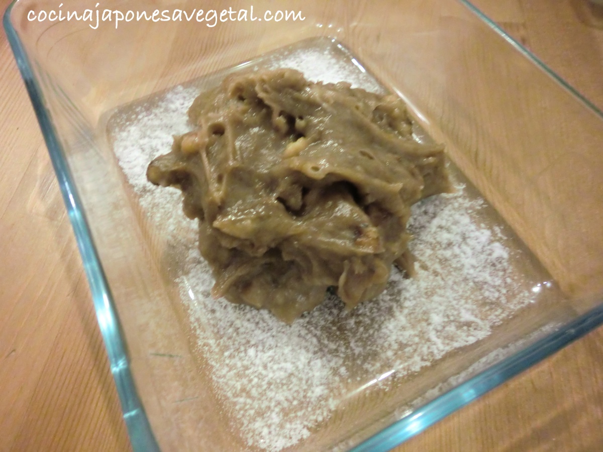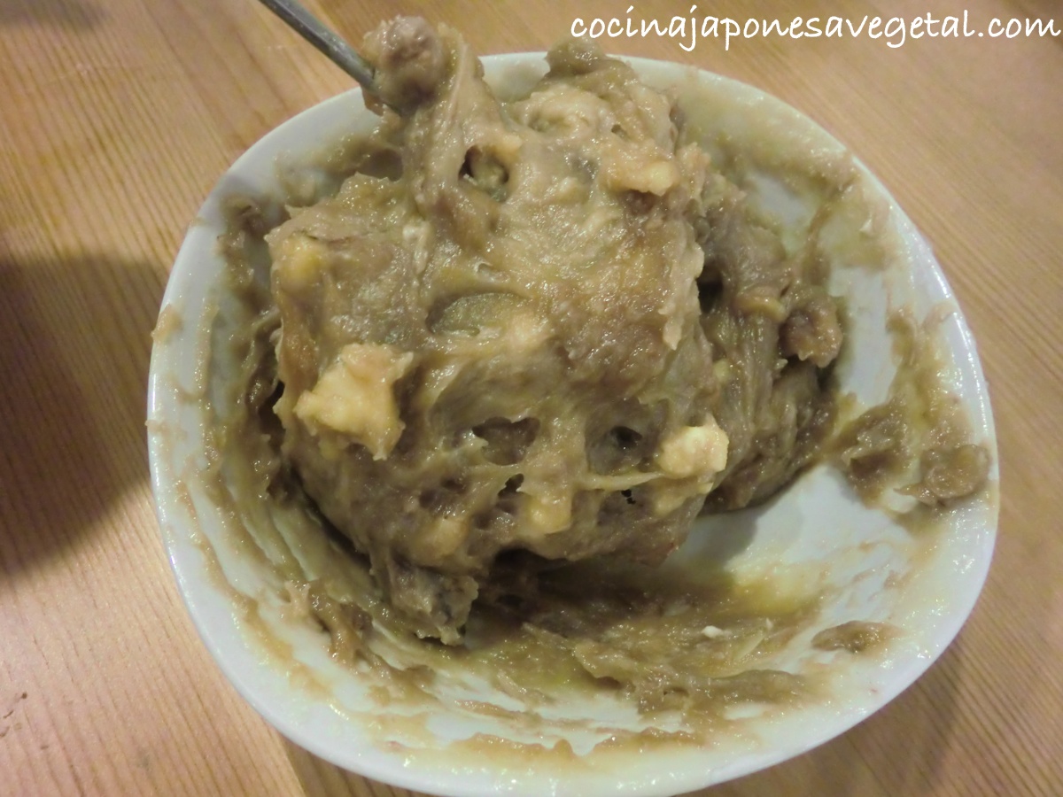 - Sacar el cuenco de la vaporera y remover de nuevo con una cuchara. Si después de remover, todavía se ve muy blanco, cocerlo al vapor unos minutos más (cuesta un poco removerlo porque la masa tiene una textura firme como la de gominola).