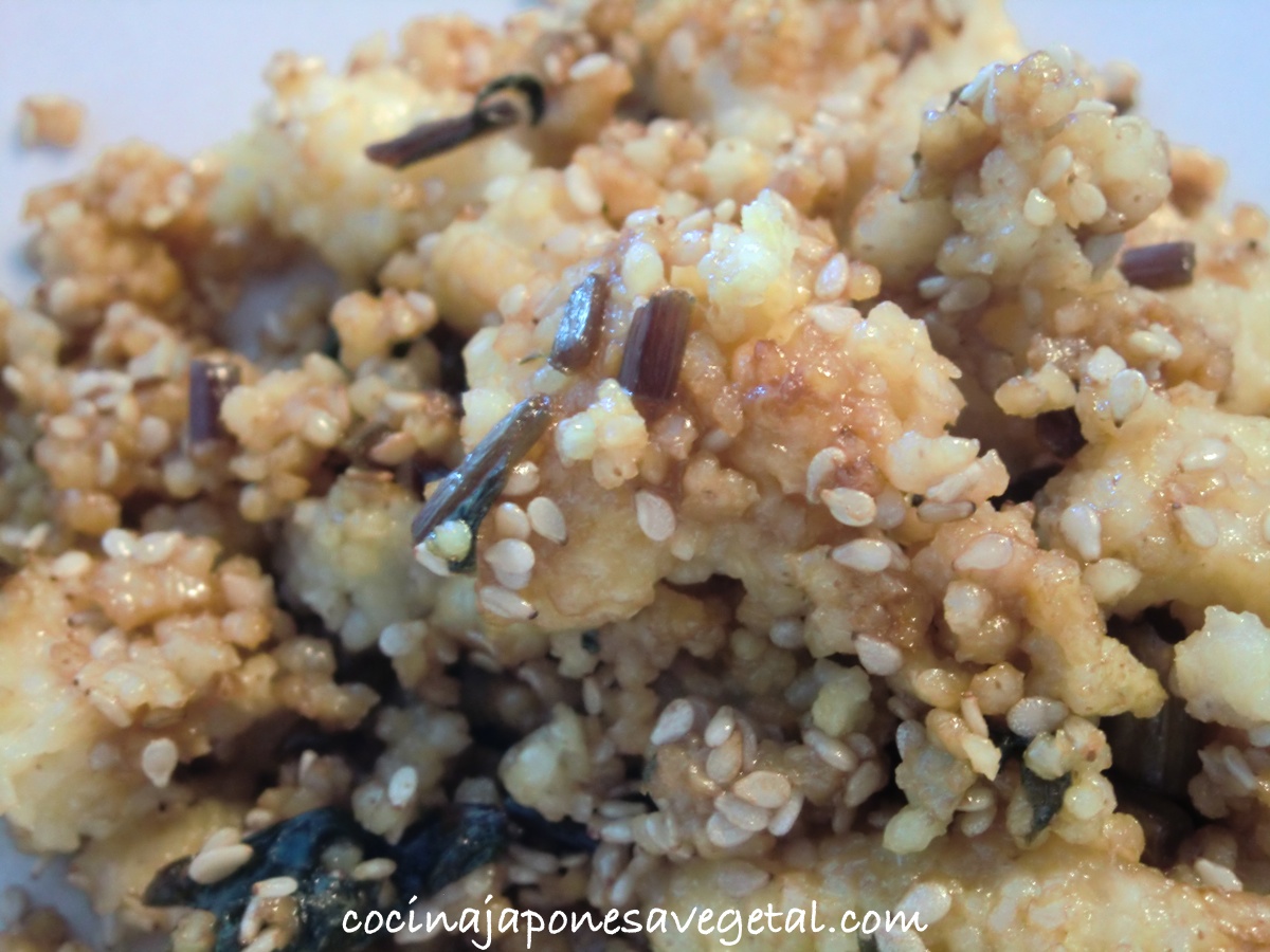 Por ejemplo, un plato tan sencillo como el salteado de mijo, se convierte en algo especial. La receta es sencilla: saltear mijo cocido con un poco de aceite de sésamo, añadir sésamo y sazonar con un poco de shooyu-zuke de hojas de rábano.