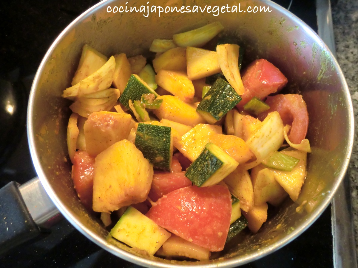 El curry vegetal se puede enriquecer añadiendo varios ingredientes como comino, miso, salsa de soja, pimiento blanco, umesu, frutos secos (anacardos, etc.), amazake, etc., pero para la receta de hoy sólo hemos utilizado ingredientes que se consiguen con relativa facilidad. Si queremos añadir otros ingredientes o cambiar una parte de los ingredientes, lo podemos hacer sin problemas.
