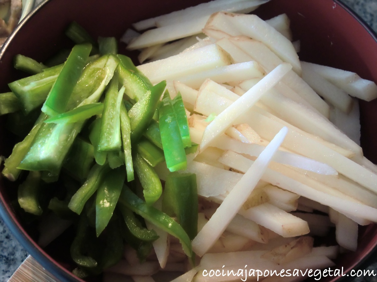 - Cuando se haya sellado y la superficie del seitán haya adquirido un color dorado, freír tambien la patata y el pimiento.