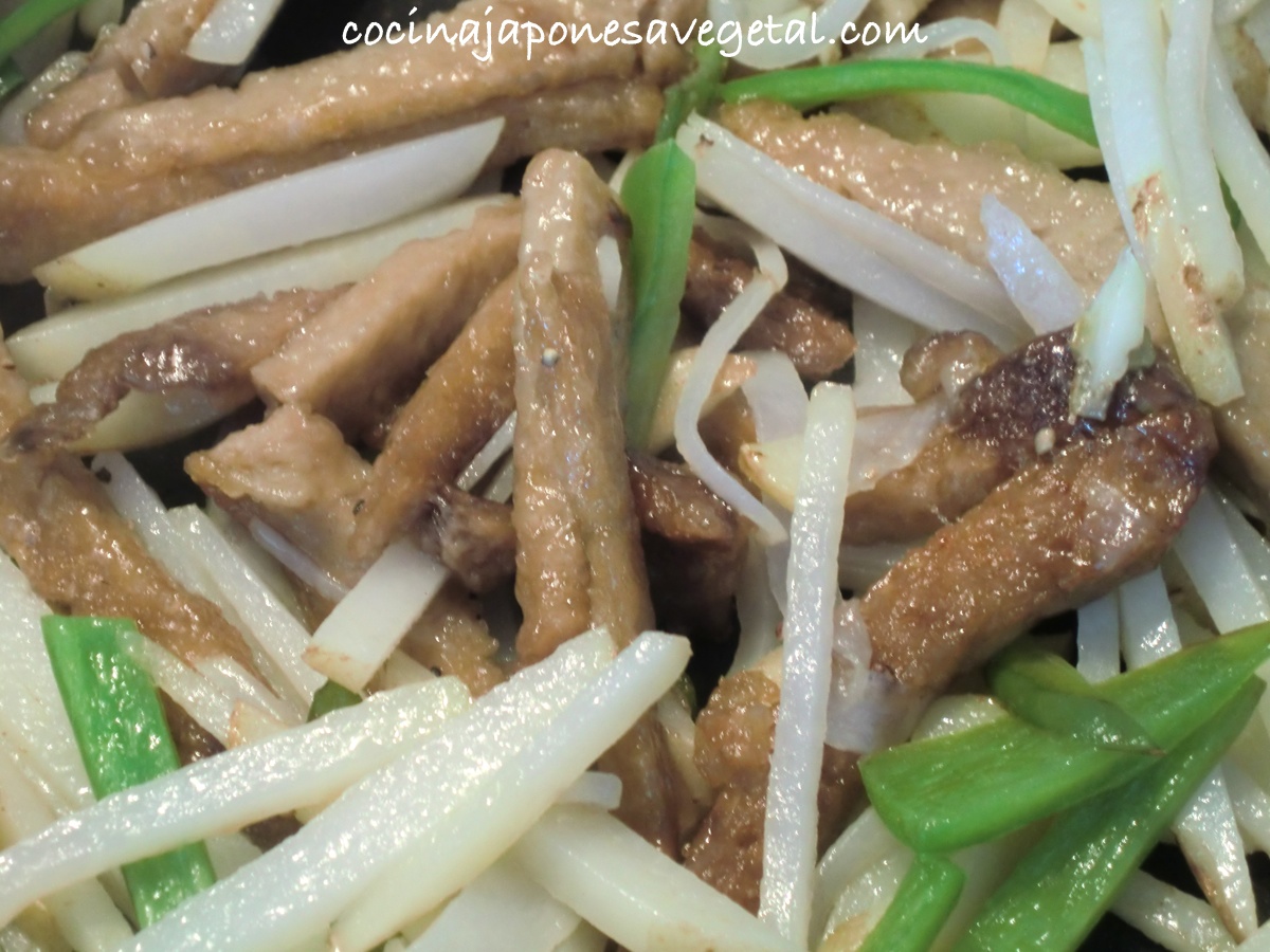 - Calentar el aceite en una sartén y freír el seitán a fuego medio fuerte.