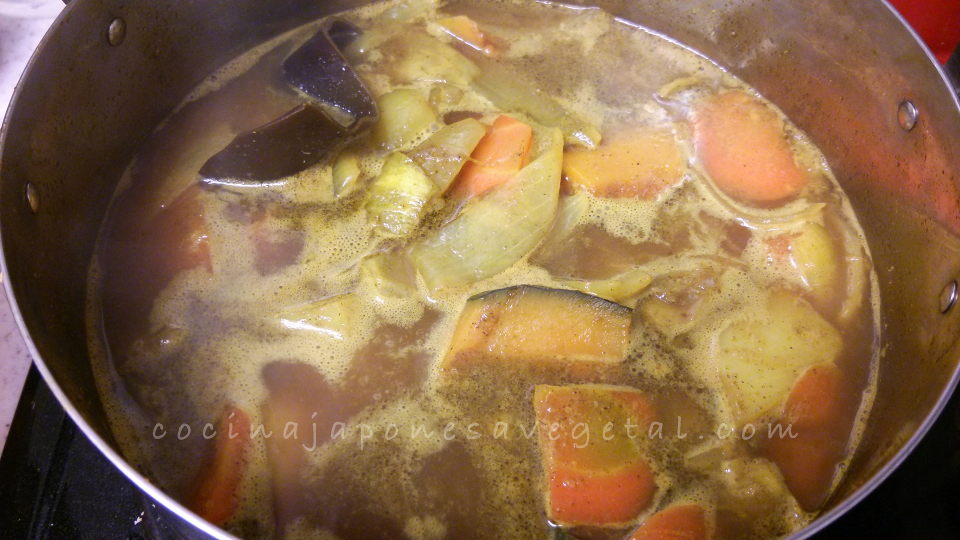 - Se agrega agua para que los ingredientes estén medio cubiertos, y se pone también salsa de soja y miso.