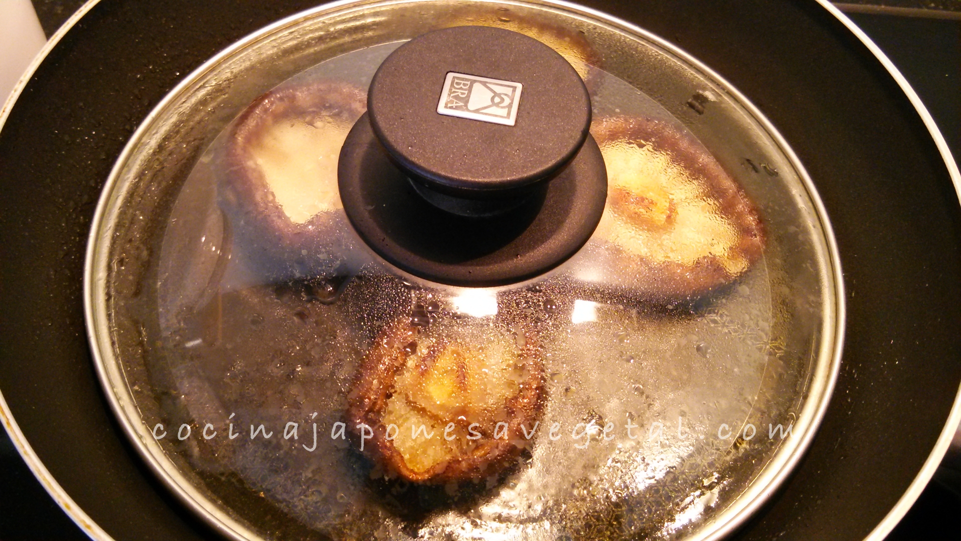 3. Poner un chorrito de aceite en una sartén y cuando esté caliente, se coloca la shiitake y se cocina a fuego lento tapado.Shiitake en sarten