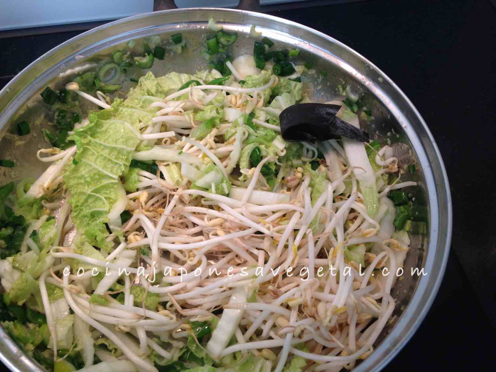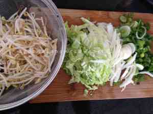 3. Cortar en tiras la col china o la cebolla tierna (o el puerro) y lavar y escurrir bien los brotes de soja