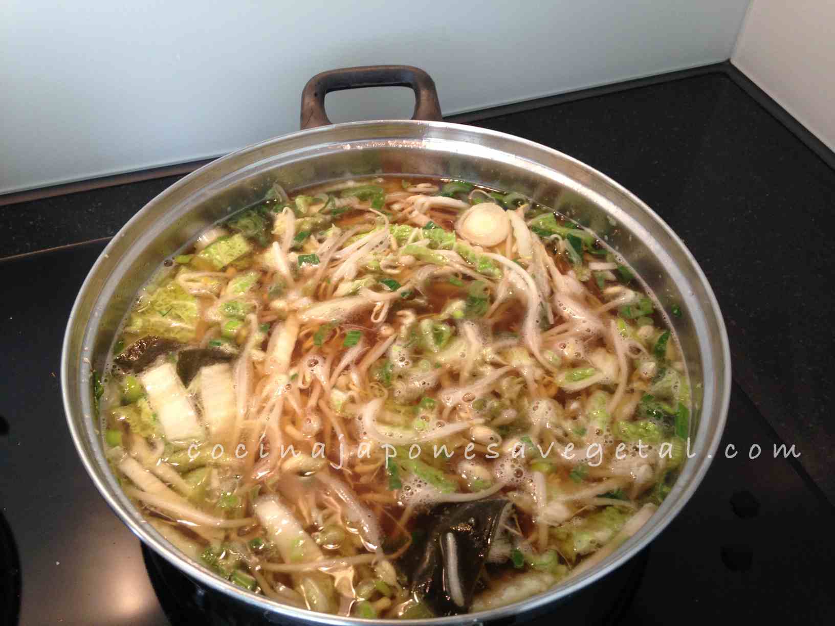 5. Cuando las verduras estén ligeramente tiernas, se les añade agua, el trozo de alga kombu, sal marina, salsa de soja y pimienta blanca, y cocer algunos minutos más hasta que las verduras estén hechas